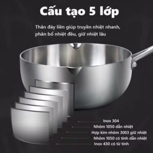 ♦ Lớp dưới cùng là inox 430 dày 0.6mm tiếp nhận cảm ứng từ, cho gia nhiệt độ chuẩn xác và nhanh chóng.