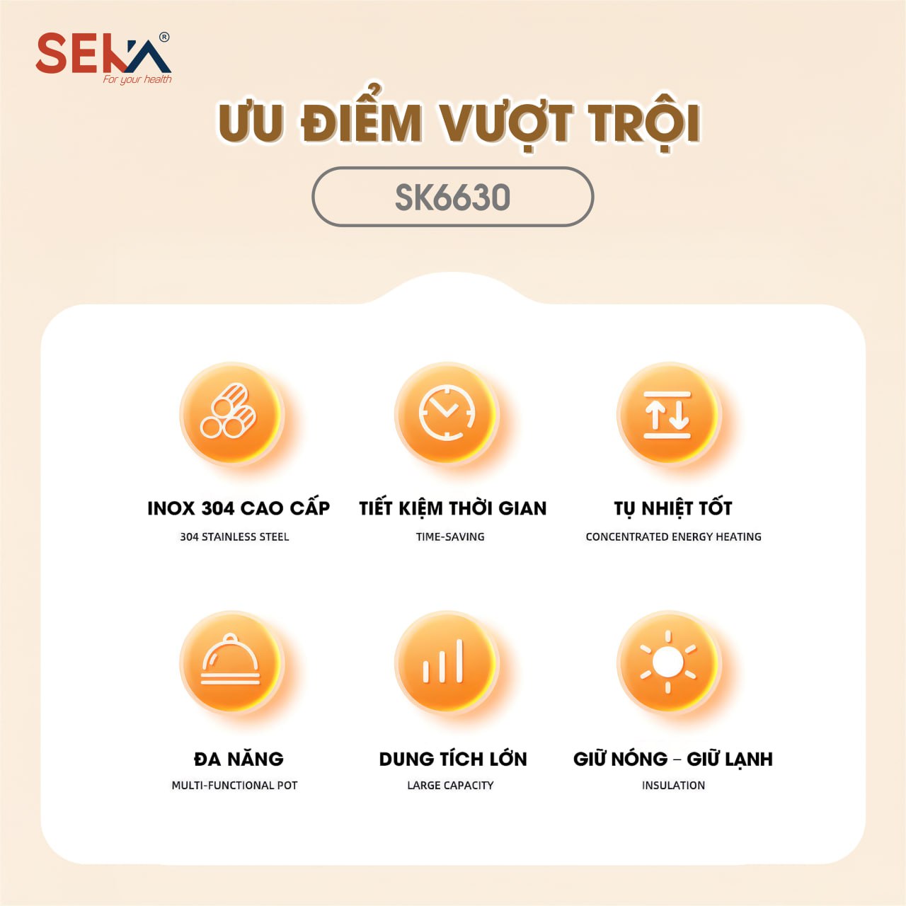 Nồi ủ chân không 2 tay cầm Seka được thiết kế thông minh với tay cầm 2 bên chắc chắn, vung kính cường lực dễ quan sát, thân nồi inox cao cấp phủ màu sang trọng mang đến những trải nghiệm tối ưu nhất cho người dùng. Ngoài ra nồi ủ Seka còn được thiết kế thêm quai xách giúp tiện lợi hơn khi mang đi.