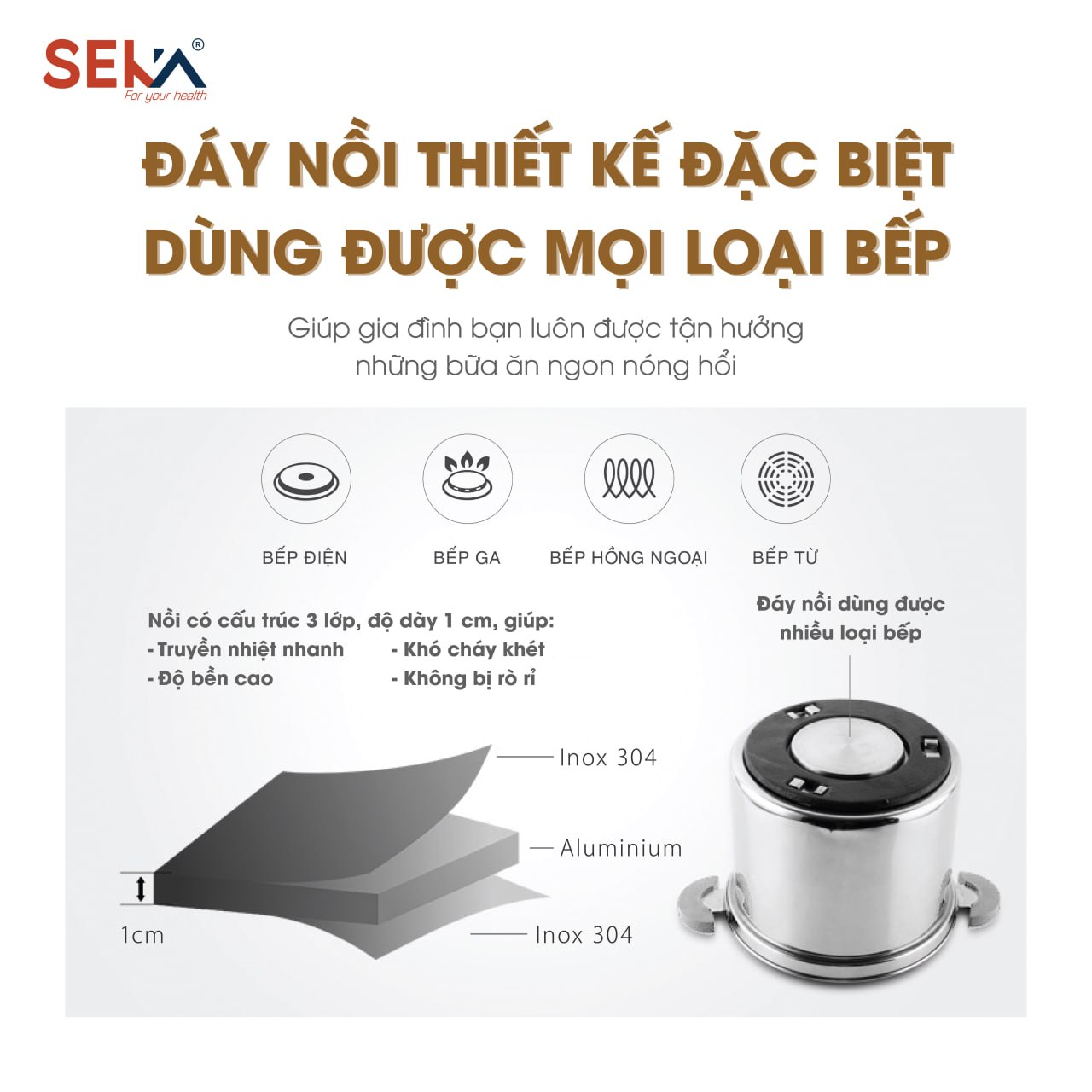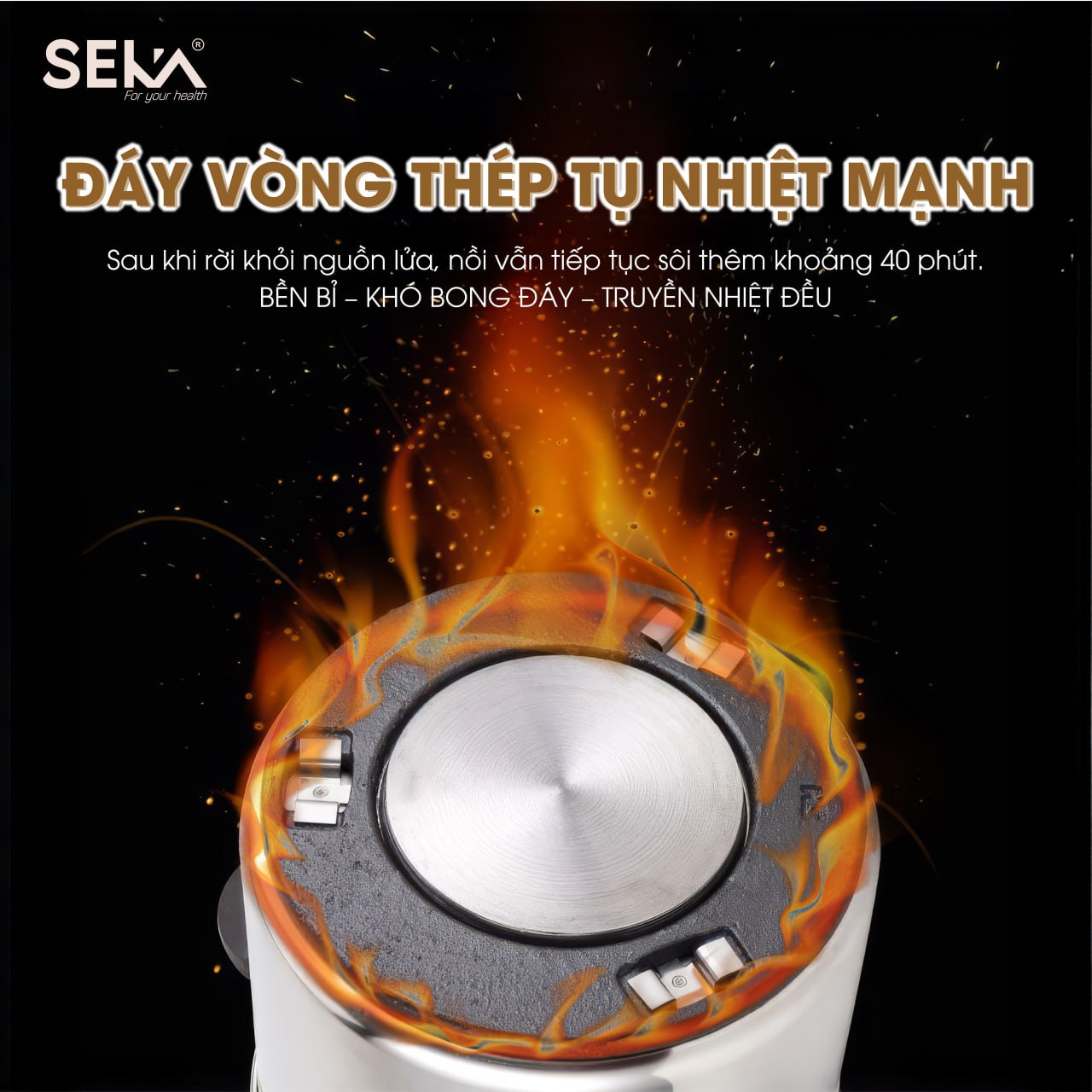 Công nghệ độc quyền của nồi Seka là đáy gắn thêm vòng gang tụ nhiệt mạnh giúp nồi tiếp tục sôi sau khi tắt bếp. Nhờ đó thức ăn được chín mềm hơn